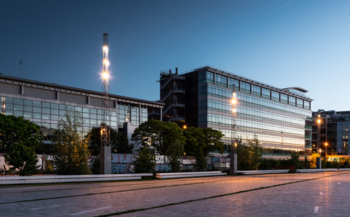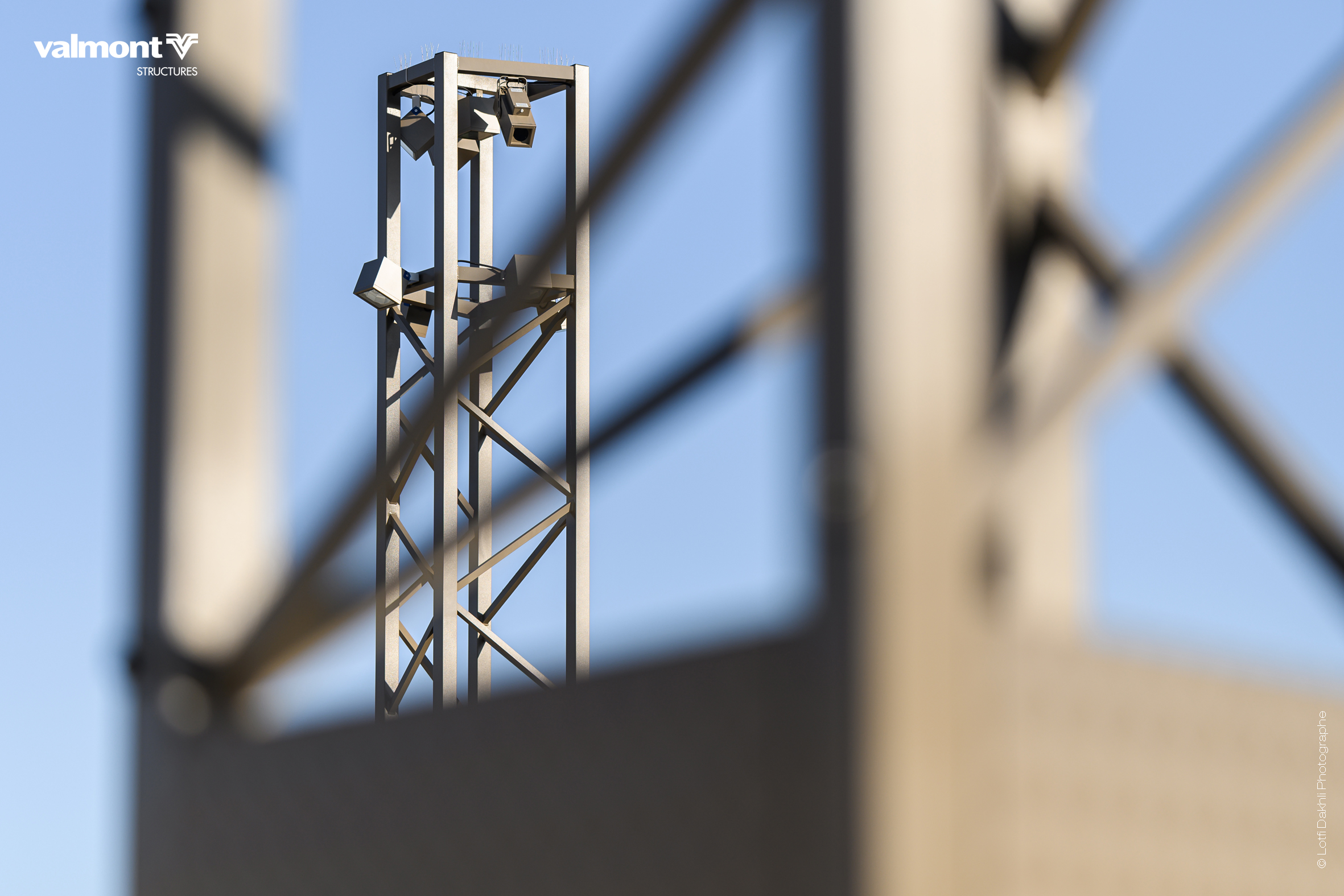 « L’architecture des mâts fait référence aux ouvrages de franchissement des canaux de cette ville maritime et au langage ferroviaire. Tels des ponts-bascules, ils sont constitués d’un enchevêtrement de poutres façon ‘Eiffel’. Imposants mais ajourés, ils ont également l’avantage de dégager le champ visuel du parvis”