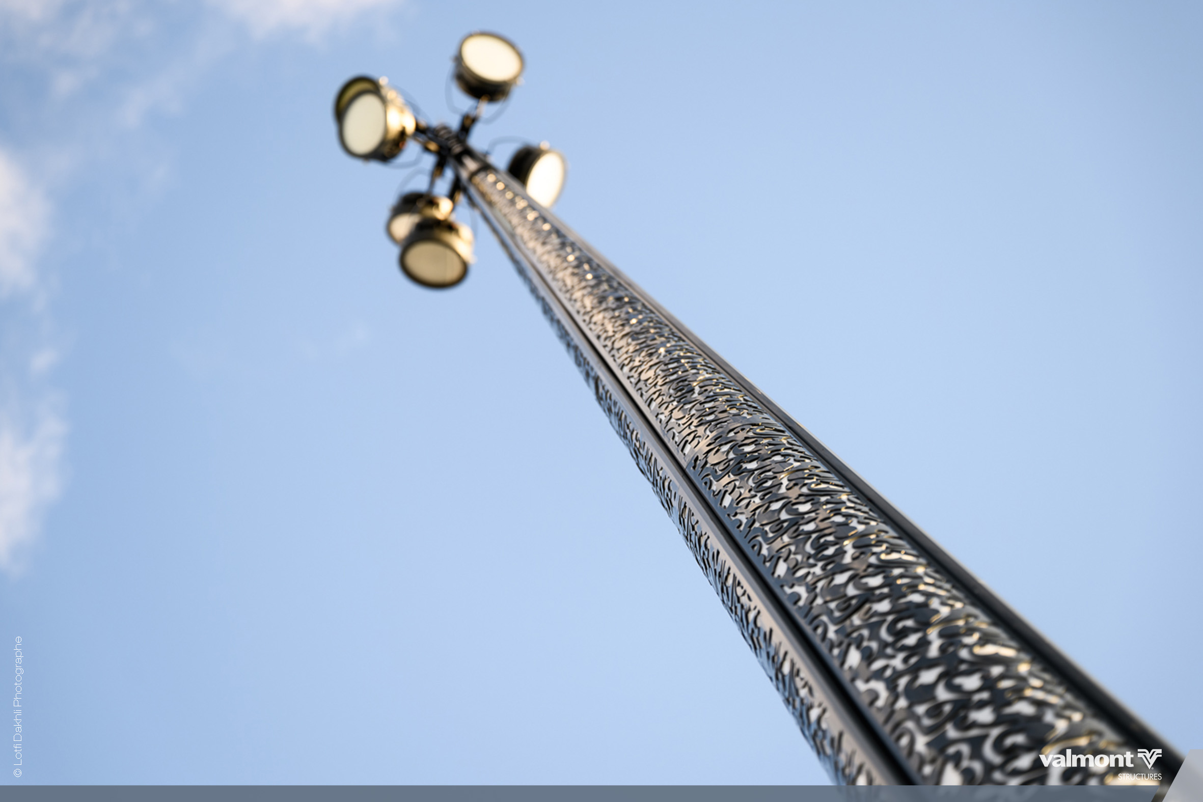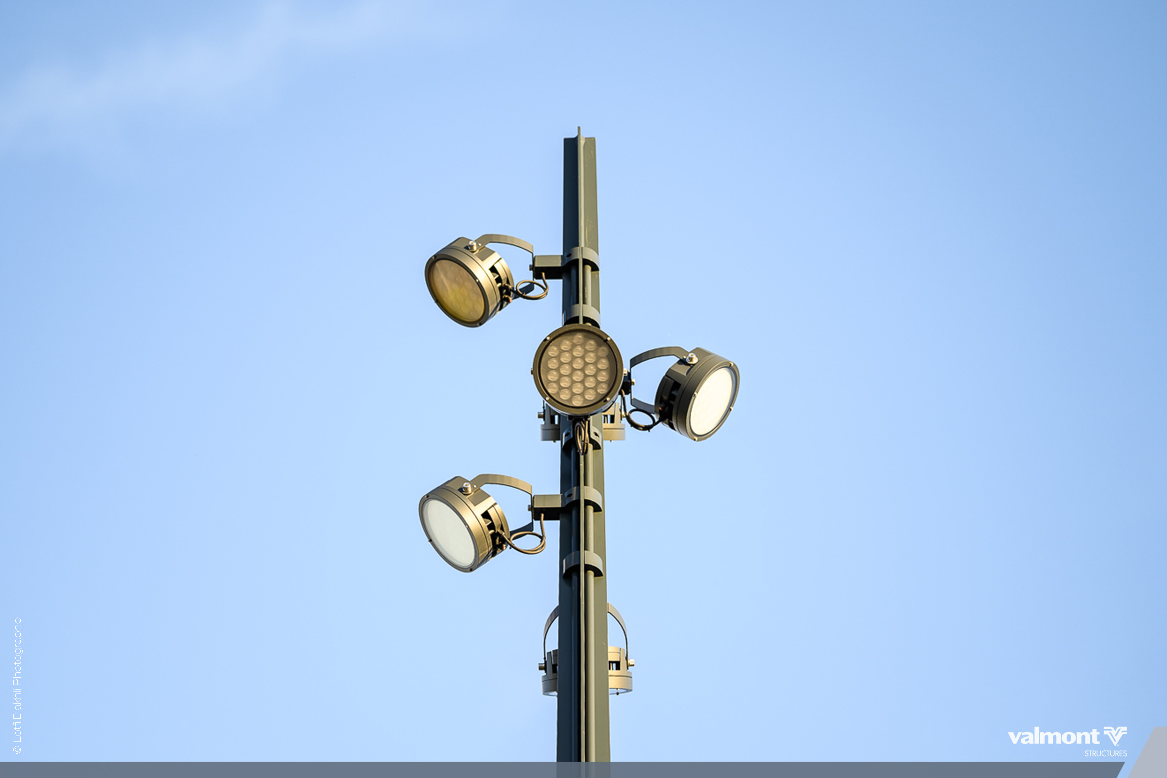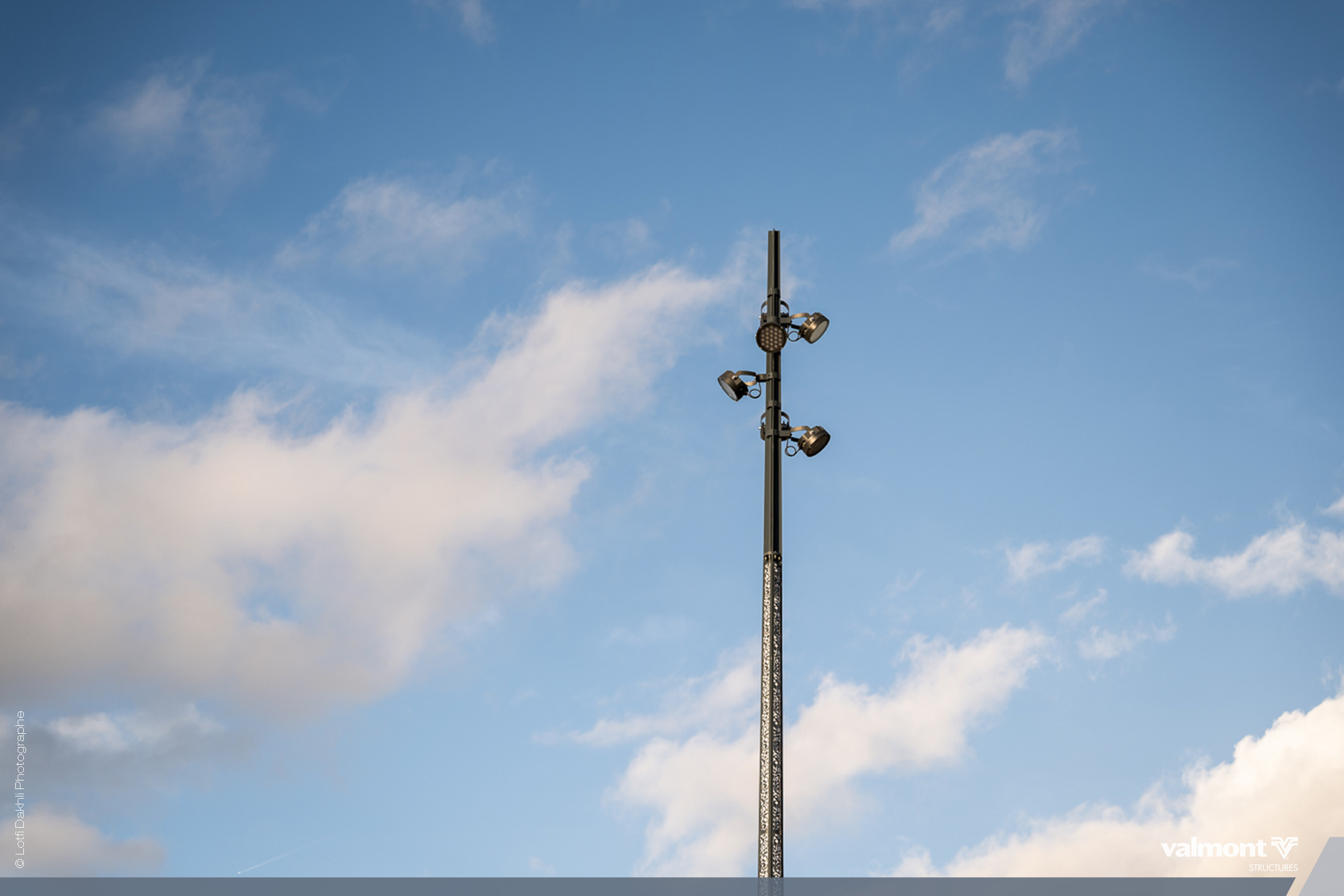 Issu de la collection Mât X Eclairage, ce specimen de 16m a été spécialement conçut pour le projet selon les attentes de la maitrise d’oeuvre.